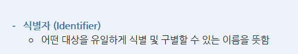 식별자를 사용하기 위해선 우리끼리 정해진 규칙이 있는데요. 총 4가지가 있는데 그 규칙은 다음과 같습니다. ①키워드를 사용하면 안 됨 ②특수문자는 언더바( _ )만 사용함 ③숫자로 시작하면 안됨 ④공백을 포함할 수 없음